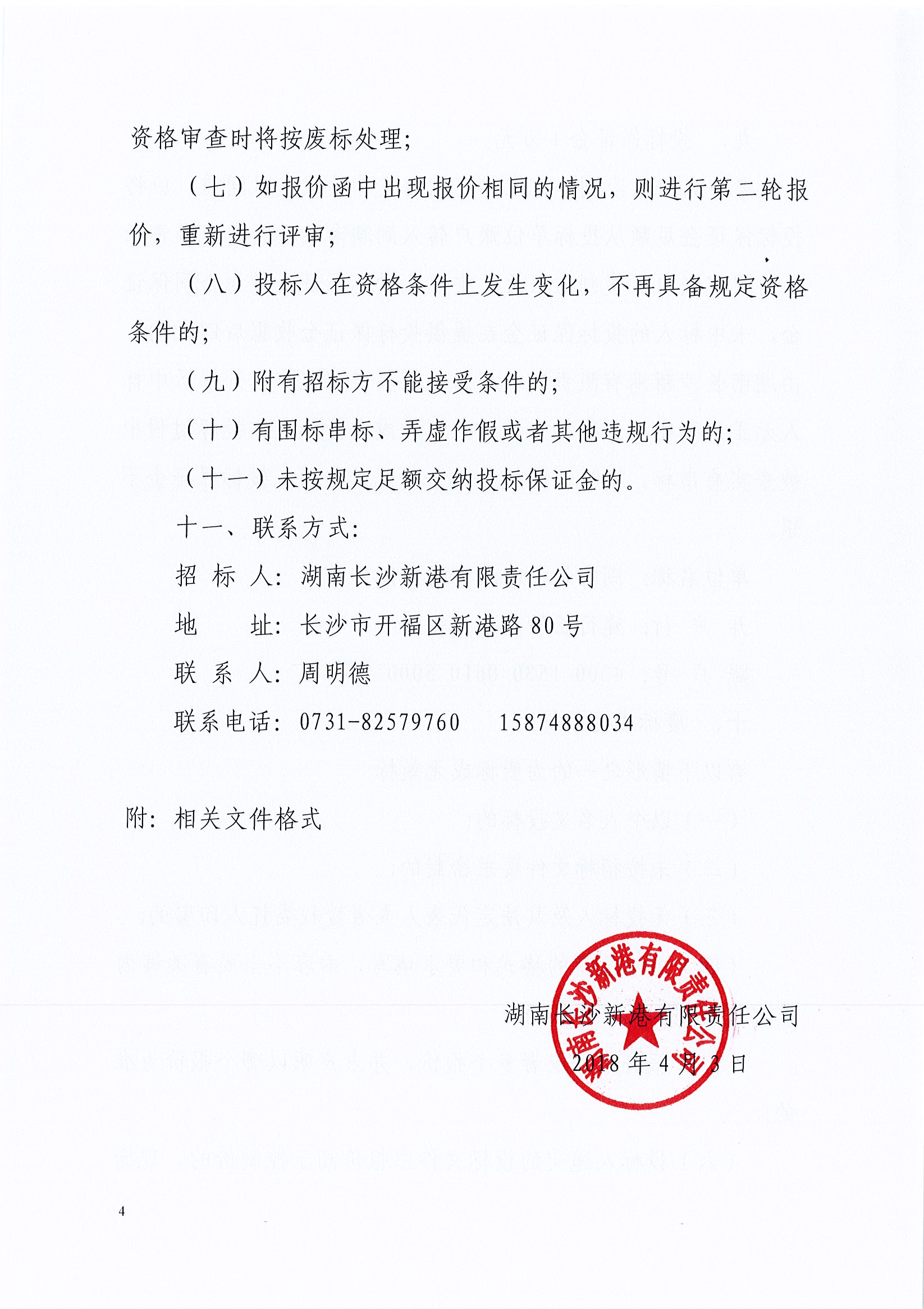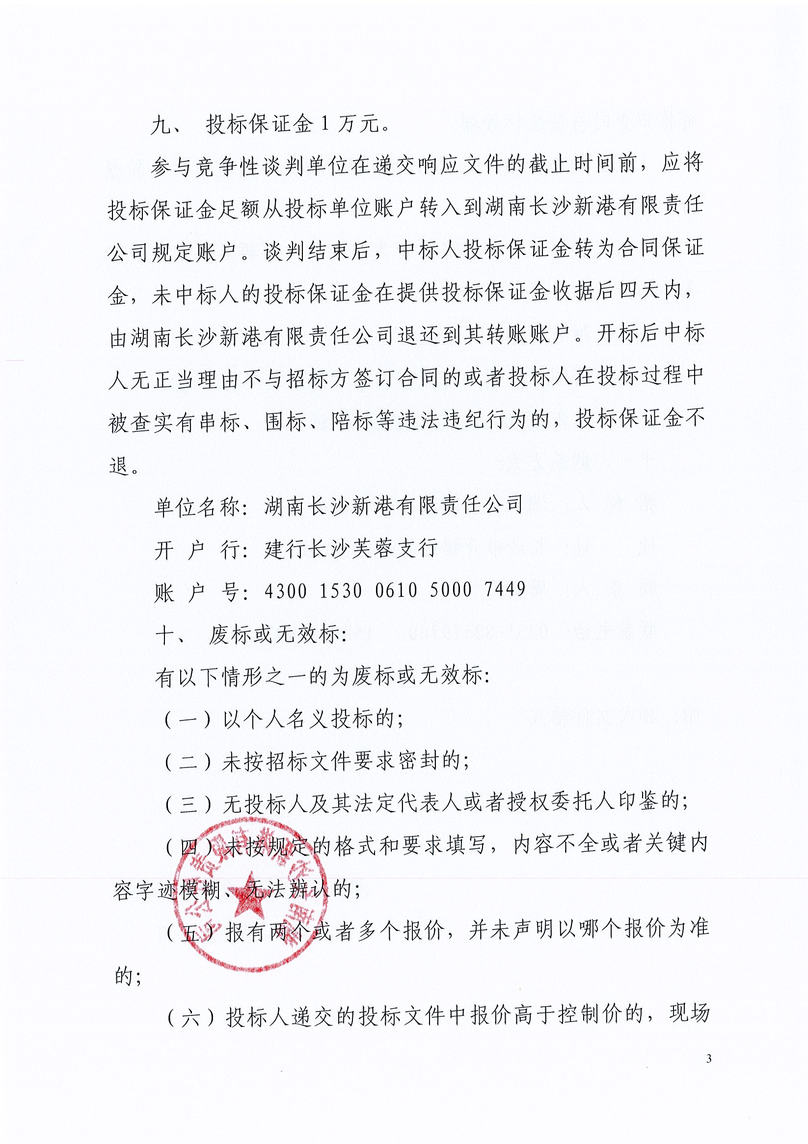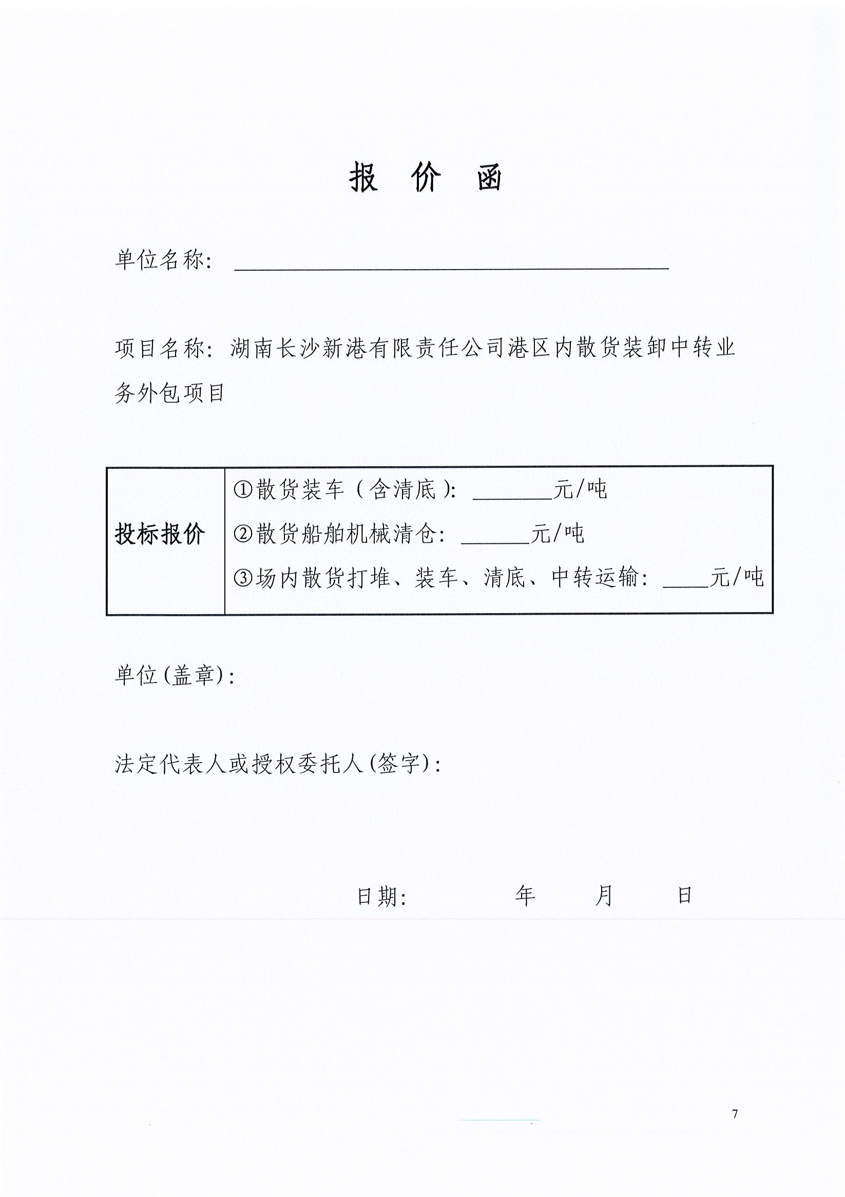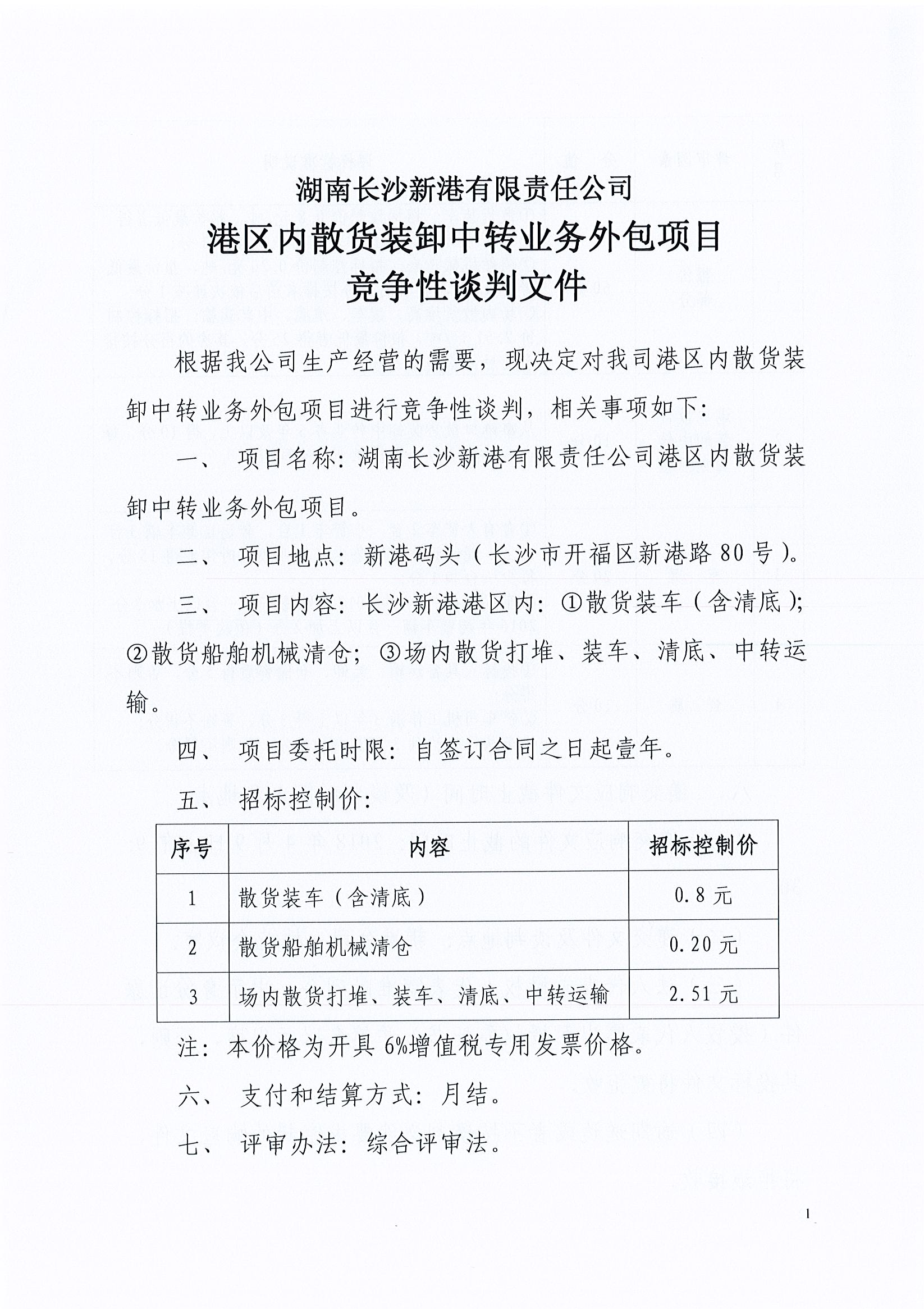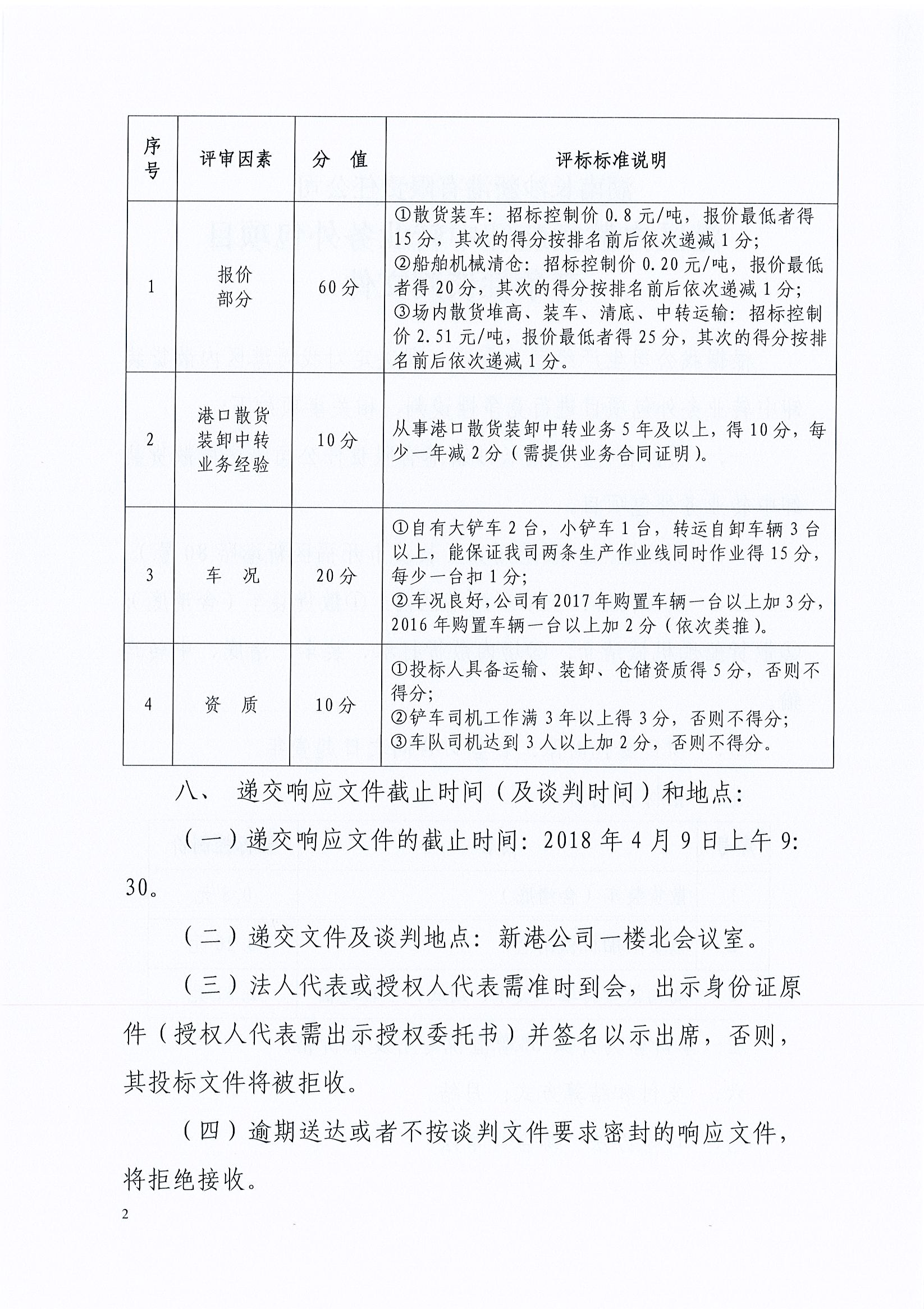 我公司決定對港區(qū)內(nèi)散貨裝卸中轉(zhuǎn)業(yè)務(wù)外包項目按照一般競爭性談判方式選擇外包單位,歡迎符合條件的單位參與項目的競爭談判。 一、 項目名稱:湖南長沙新港有限責(zé)任公司港區(qū)內(nèi)散貨裝卸中轉(zhuǎn)業(yè)務(wù)外包項目 二、 項目內(nèi)容: 長沙新港港區(qū)內(nèi):①散貨裝車(含清底);②散貨船舶機(jī)械清倉;③場內(nèi)散貨打堆、裝車、清底、中轉(zhuǎn)運輸。 三、 項目委托期限:自簽訂合同之日起壹年。 四、 資格及資質(zhì)要求: (一)本項目不接受聯(lián)合體投標(biāo); (二)投標(biāo)人須自有大鏟車、小鏟車、轉(zhuǎn)運自卸車輛,能保證我司兩條生產(chǎn)作業(yè)線同時作業(yè); (三)投標(biāo)人鏟車司機(jī)、車隊司機(jī)須持有相關(guān)職業(yè)資格證; (四)投標(biāo)人遞交響應(yīng)文件時須提交以下證明材料(復(fù)印件需加蓋公章): 1.企業(yè)法人營業(yè)執(zhí)照副本復(fù)印件; 2.法人資格證明書或具有單位公章及法定代表人簽章的授權(quán)委托書、法人身份證原件(或復(fù)印件); 3.投標(biāo)人自有車輛購置證明材料、司機(jī)職業(yè)資格證明材料復(fù)印件; 4.投標(biāo)人類似項目業(yè)績證明材料; 5.投標(biāo)人身份證原件及復(fù)印件。 五、招標(biāo)文件的獲取方式:招標(biāo)文件見本公告附件,投標(biāo)人在投標(biāo)截止時間前可自行下載或前往我司515室領(lǐng)取。 六、遞交響應(yīng)文件截止時間(及談判時間)和地點: (一)遞交響應(yīng)文件的截止時間:2018年4月9日上午9:30。 (二)遞交文件及談判地點:新港公司一樓北會議室。 (三)法人代表或授權(quán)人代表需準(zhǔn)時到會,出示身份證原件(授權(quán)人代表需出示授權(quán)委托書)并簽名以示出席,否則,其投標(biāo)文件將被拒收。 (四)逾期送達(dá)或者不按談判文件要求密封的響應(yīng)文件,將拒絕接收。 七、招 標(biāo) 方:湖南長沙新港有限責(zé)任公司 聯(lián) 系 人:周明德 聯(lián)系電話: 15874888034 2018年4月3日 附件: