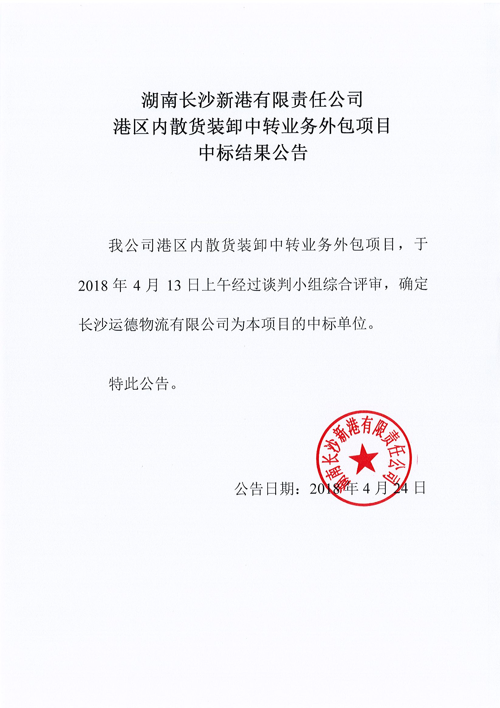 湖南長沙新港有限責任公司 港區(qū)內散貨裝卸中轉業(yè)務外包中標結果公告