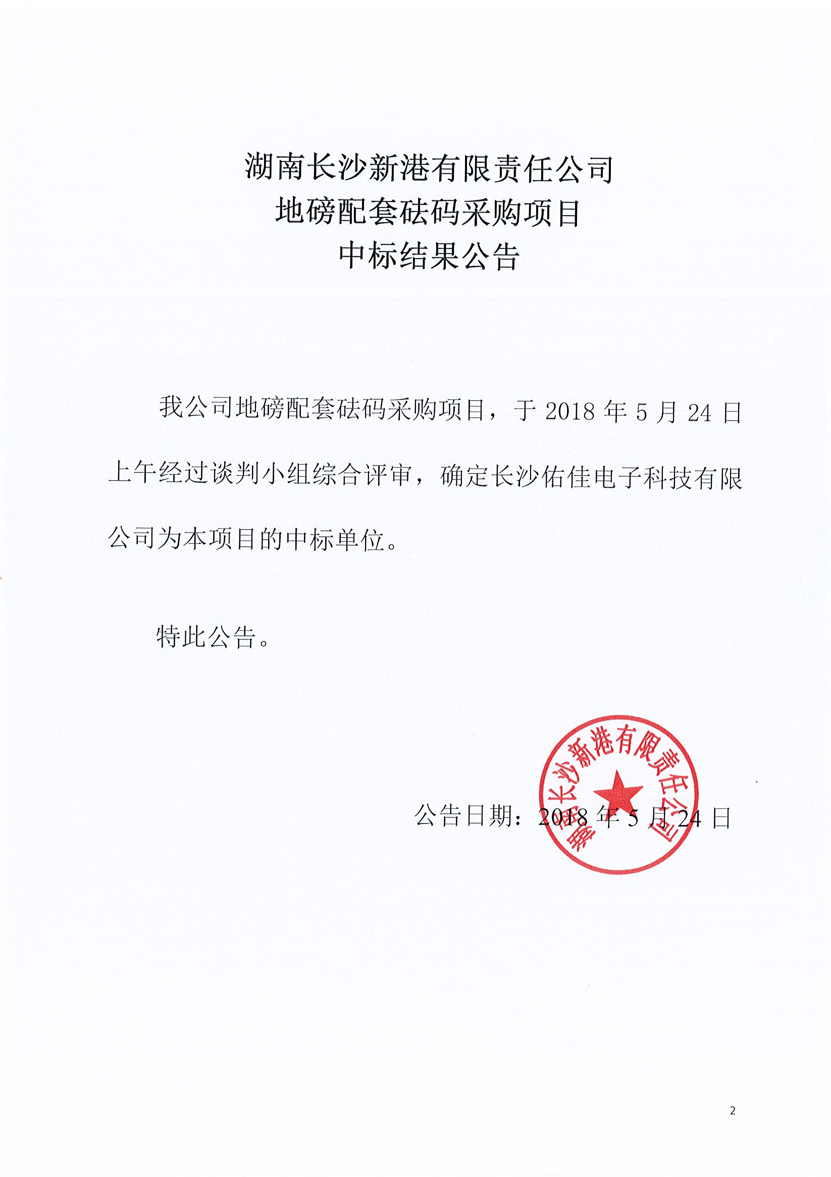 湖南長沙新港有限責(zé)任公司 地磅套砝碼采購項(xiàng)目中標(biāo)結(jié)果公告