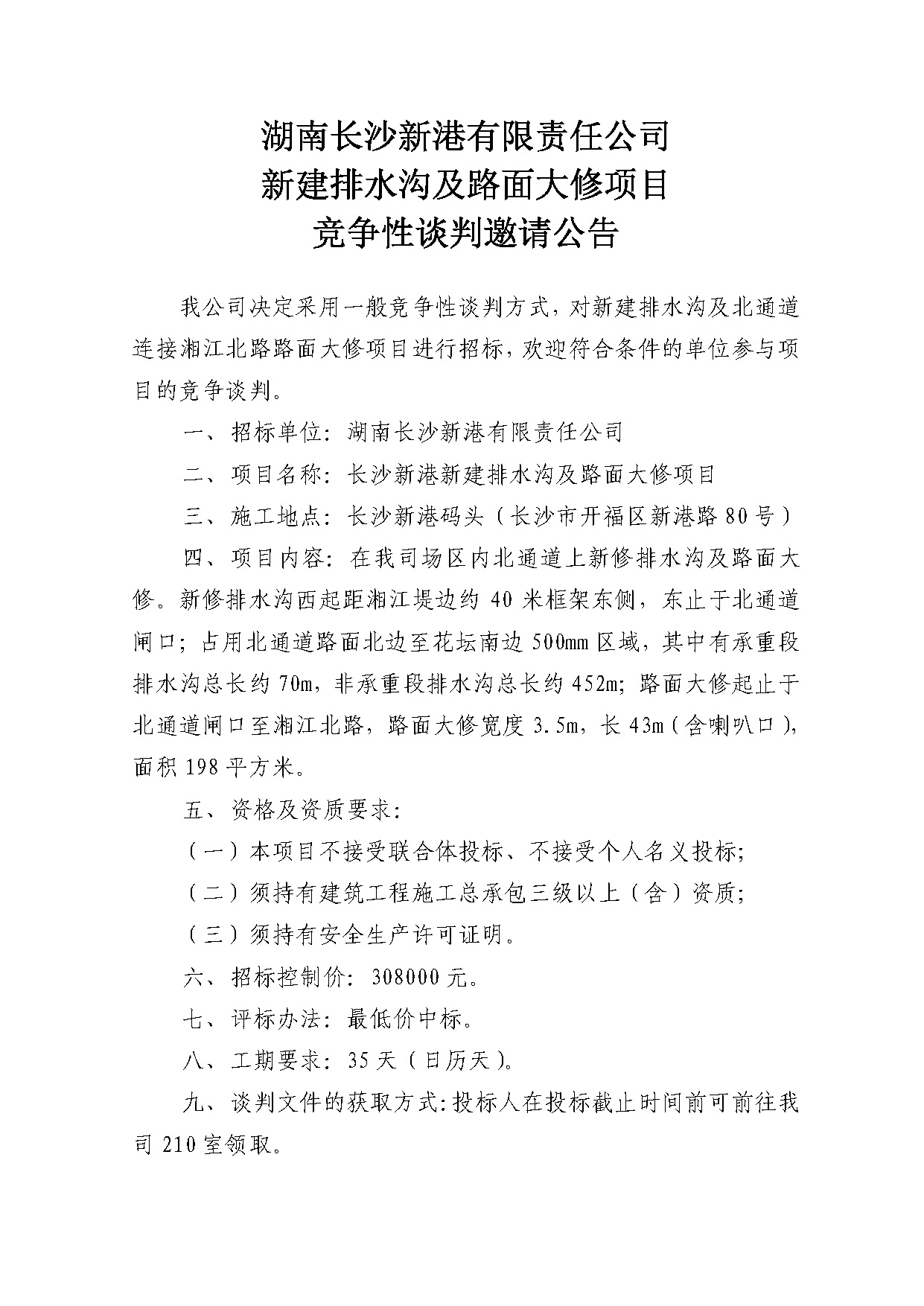 湖南長沙新港有限責任公司新建排水溝及路面大修項目邀請公告(延期)