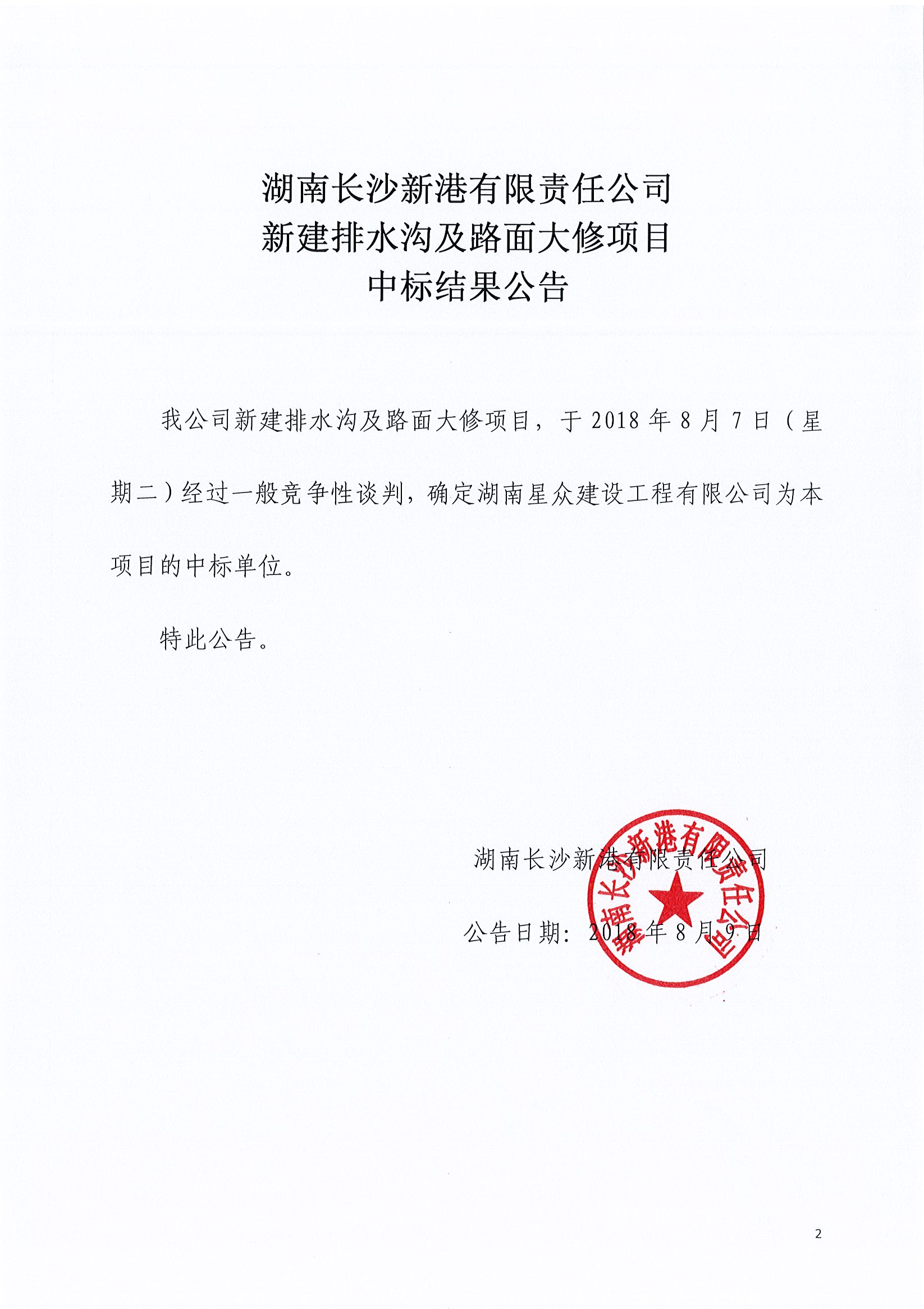 湖南長沙新港有限責任公司 新建排水溝及路面大修項目中標結果公告
