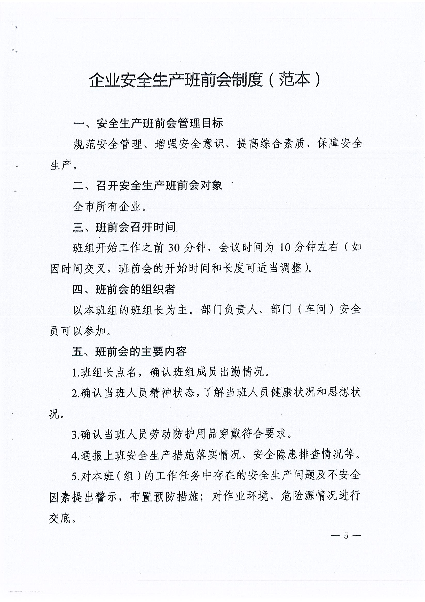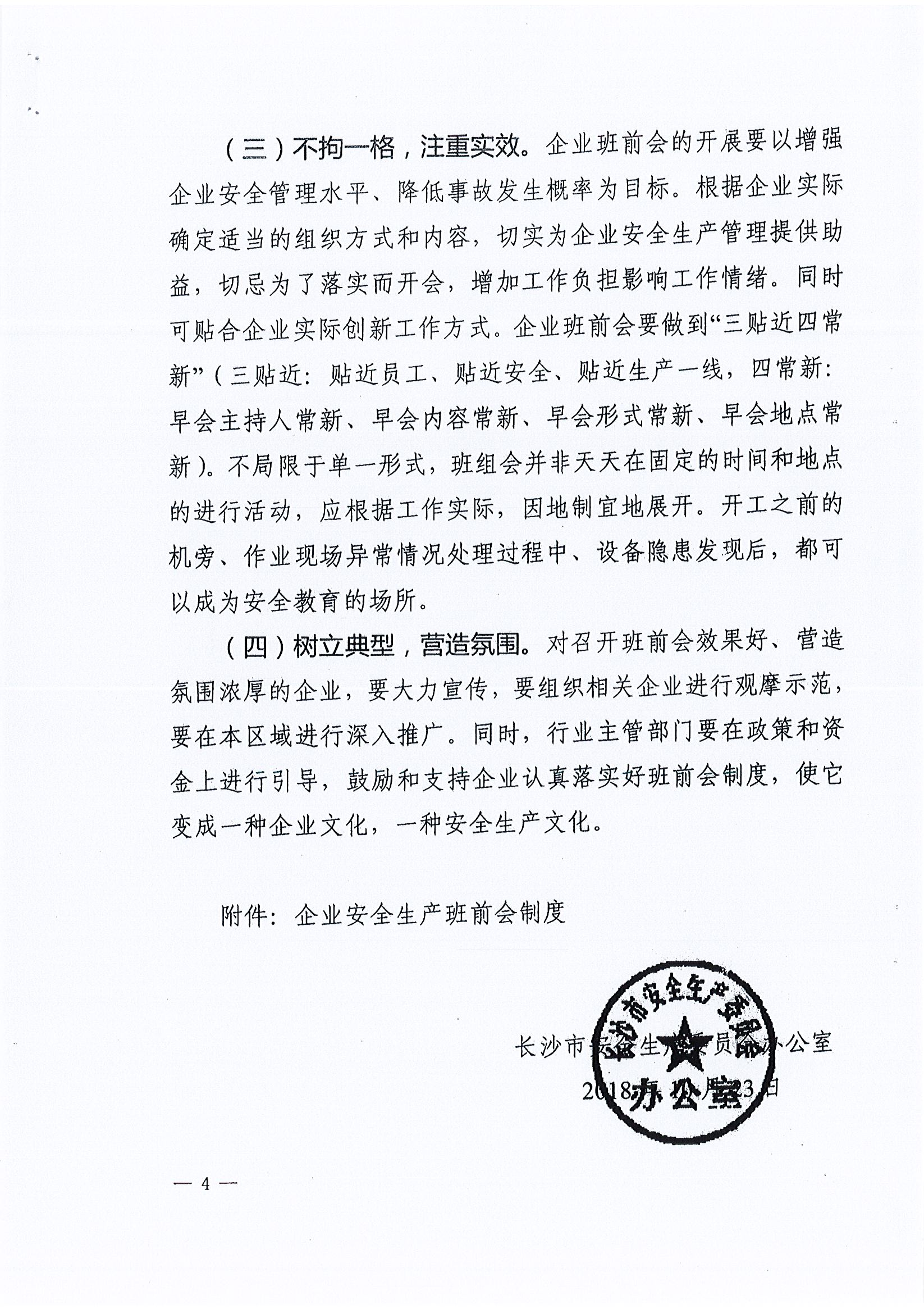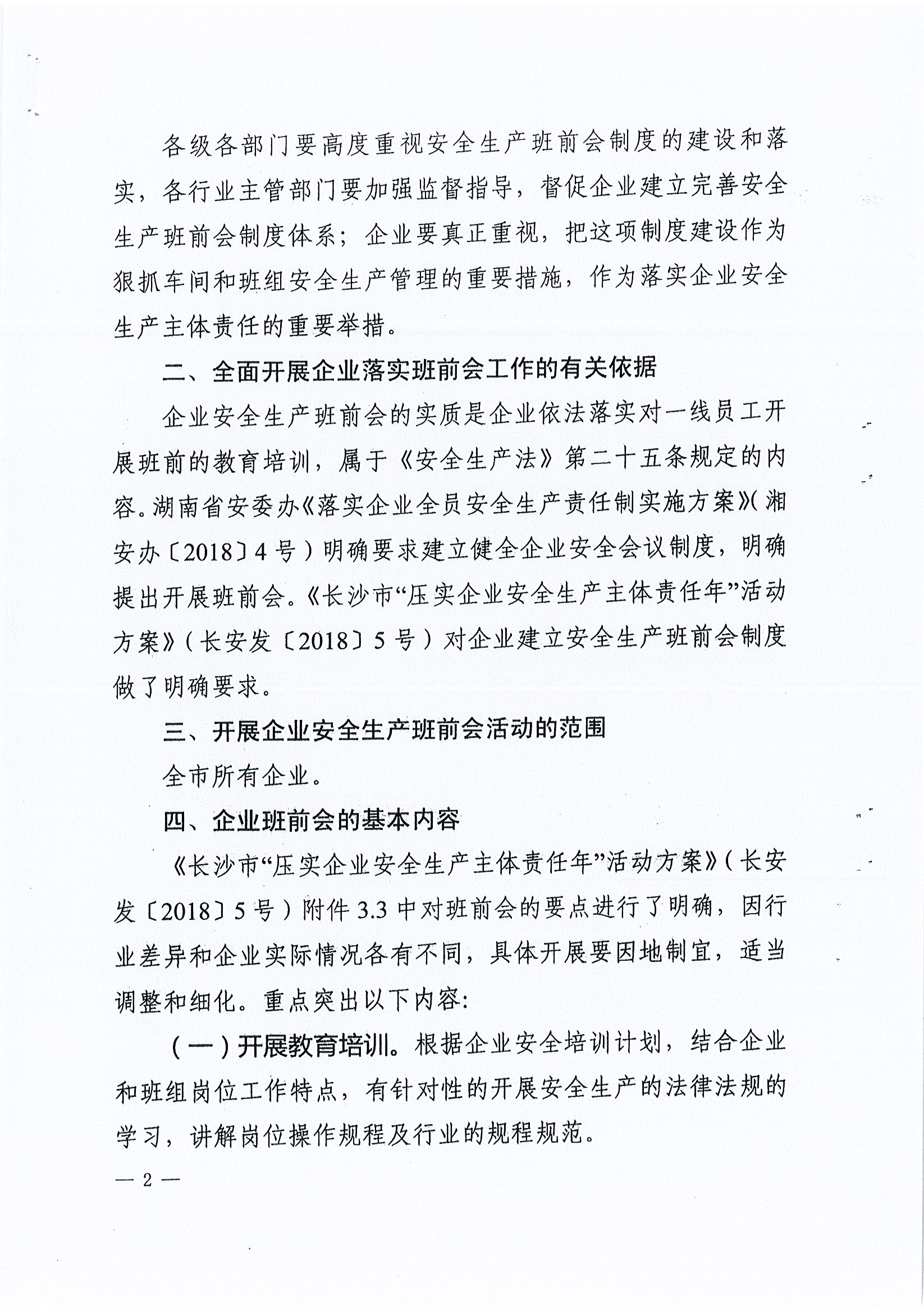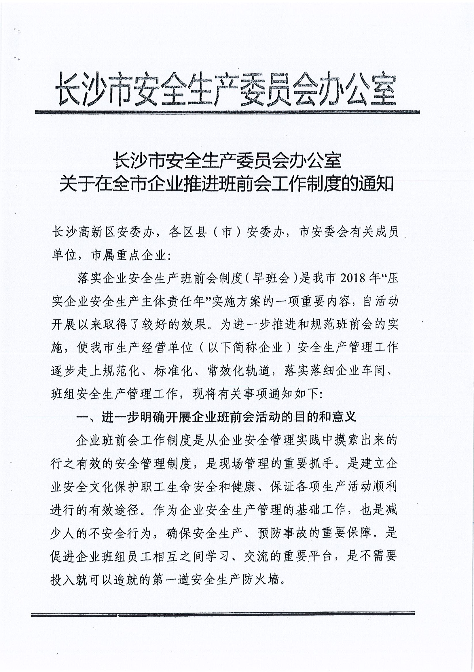 長(zhǎng)沙市安全生產(chǎn)委員會(huì)辦公室關(guān)于在全市企業(yè)推進(jìn)班前會(huì)工作制度的通知