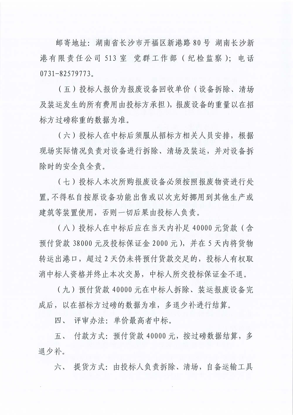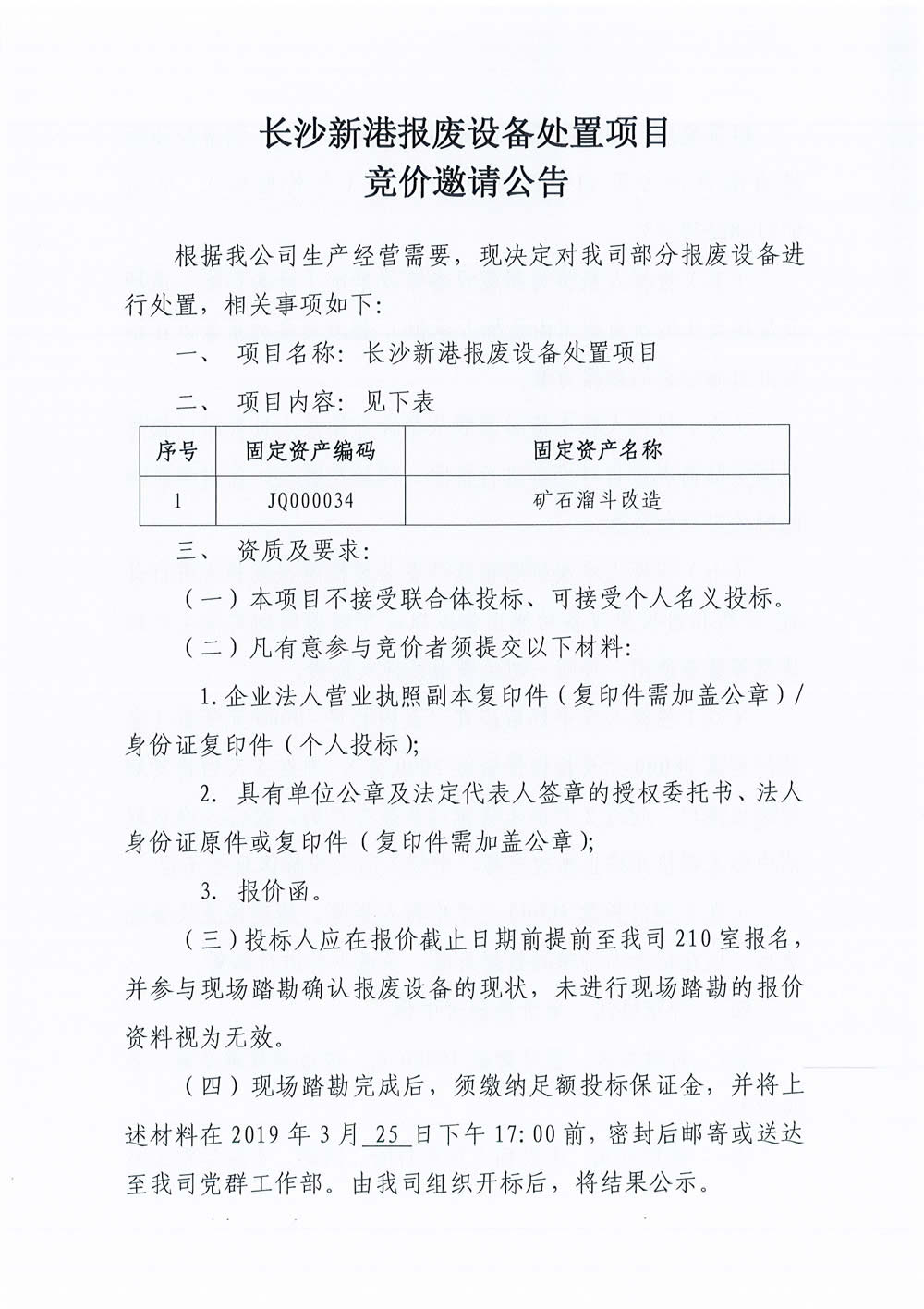 長沙新港報廢設(shè)備處置項目競價邀請公告