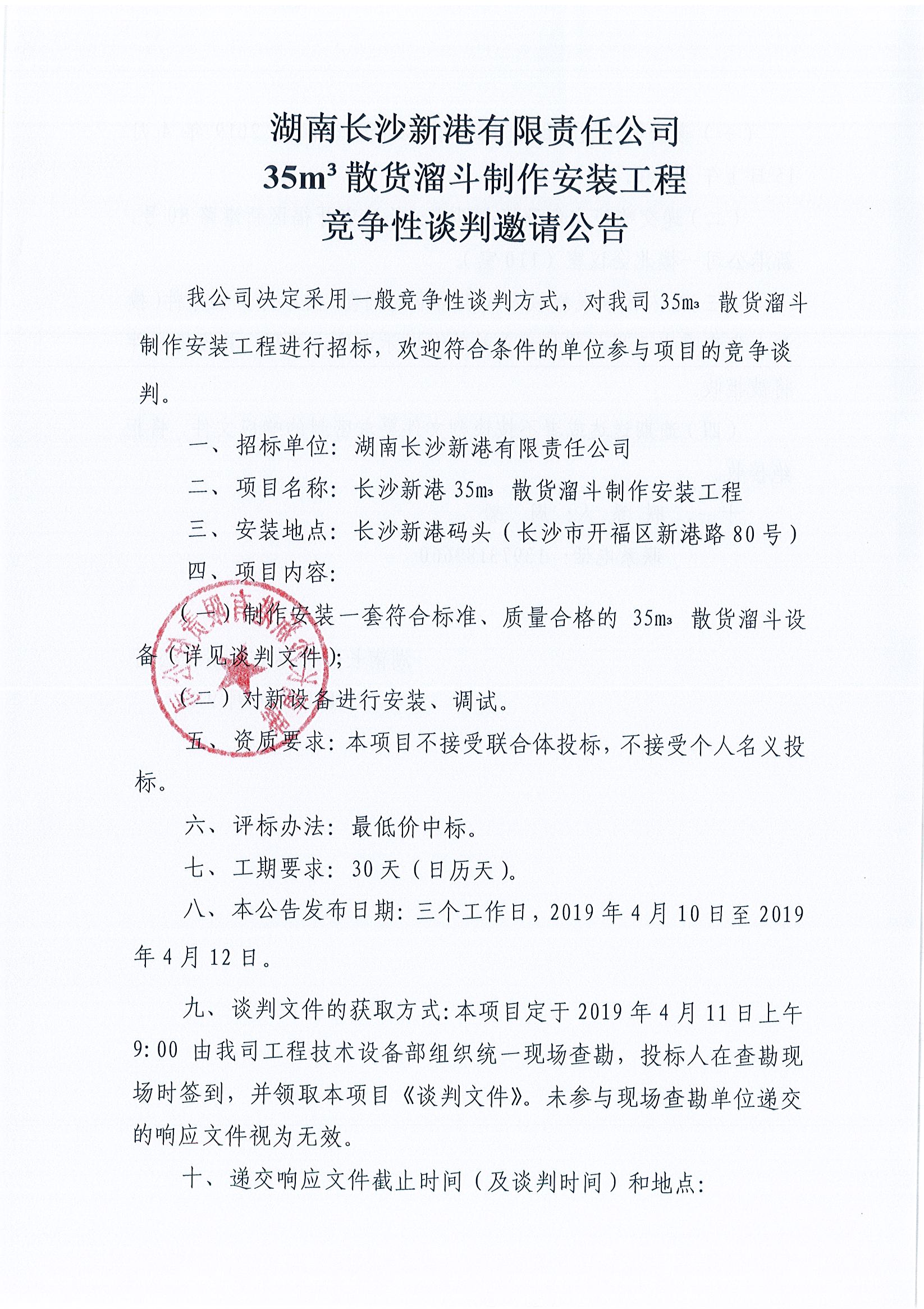湖南長沙新港有限責(zé)任公司35m³散貨溜斗制作安裝工程競爭性談判邀請公告