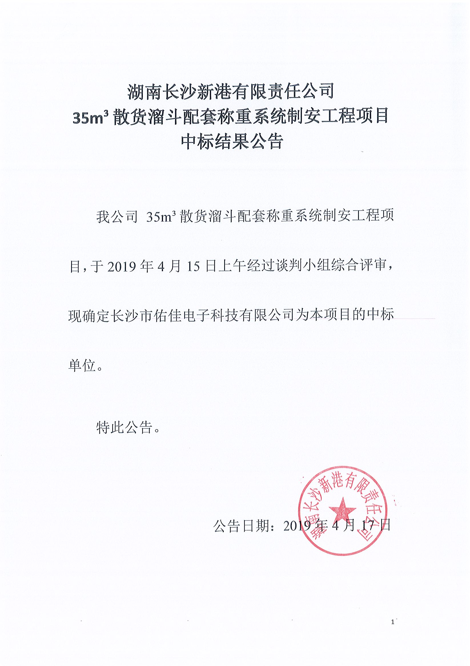 湖南長沙新港有限責(zé)任公司35m³散貨溜斗配套稱重系統(tǒng)制安工程項目中標結(jié)果公告