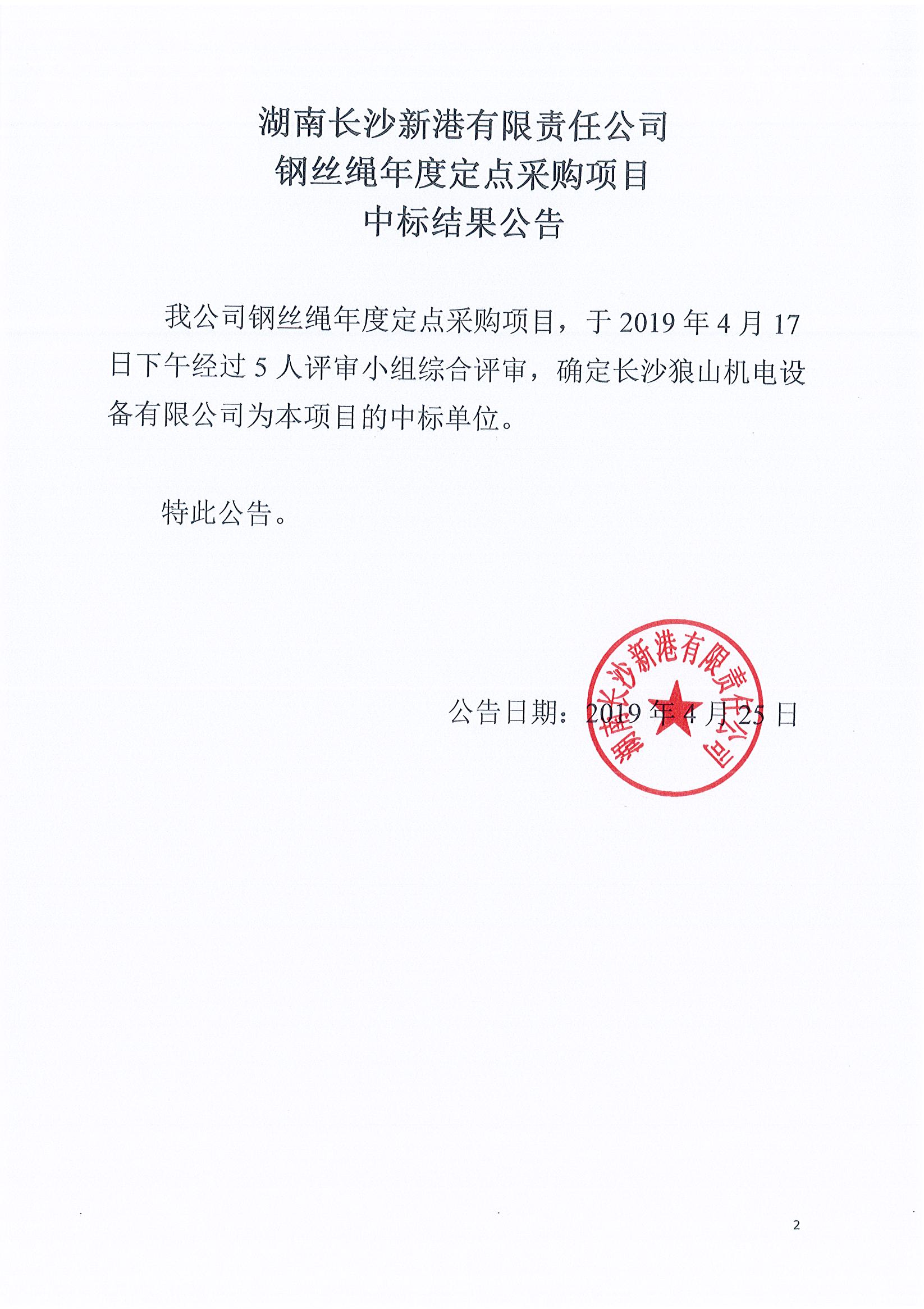 湖南長(zhǎng)沙新港有限責(zé)任公司鋼絲繩年度定點(diǎn)采購(gòu)項(xiàng)目中標(biāo)結(jié)果公告