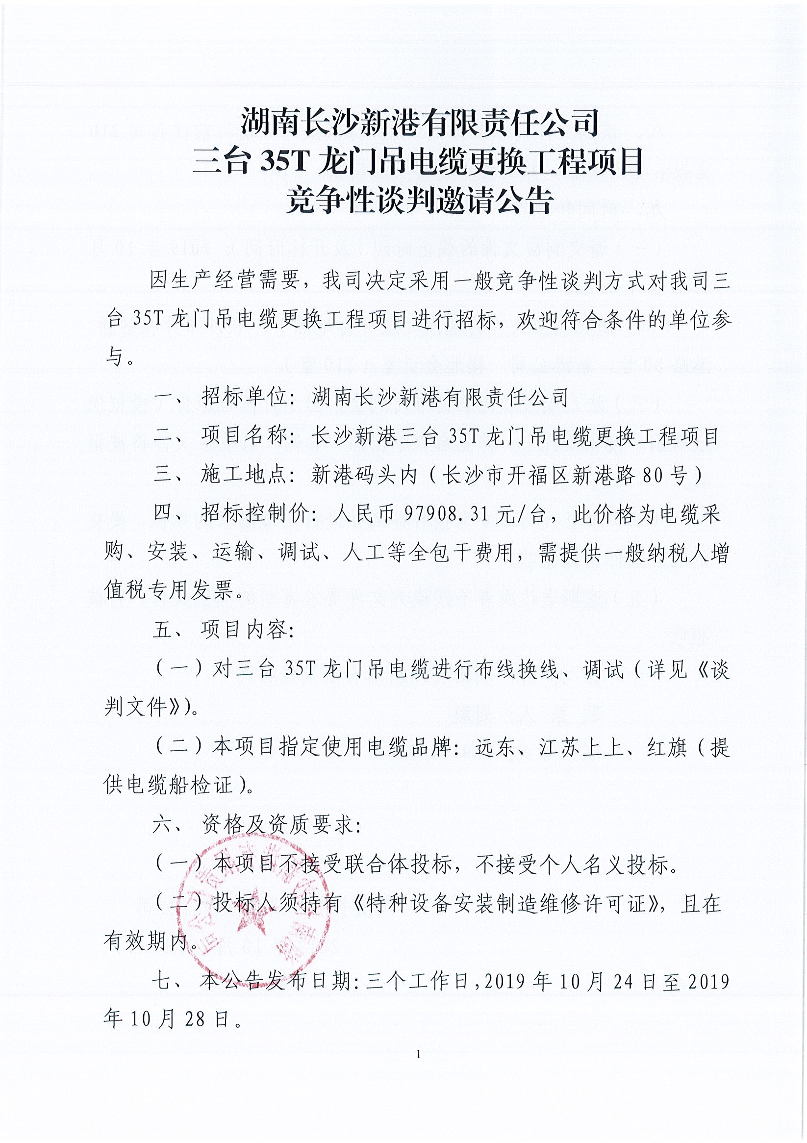 湖南長(zhǎng)沙新港有限責(zé)任公司三臺(tái)35T龍門(mén)吊電纜更換工程項(xiàng)目競(jìng)爭(zhēng)性談判邀請(qǐng)公告