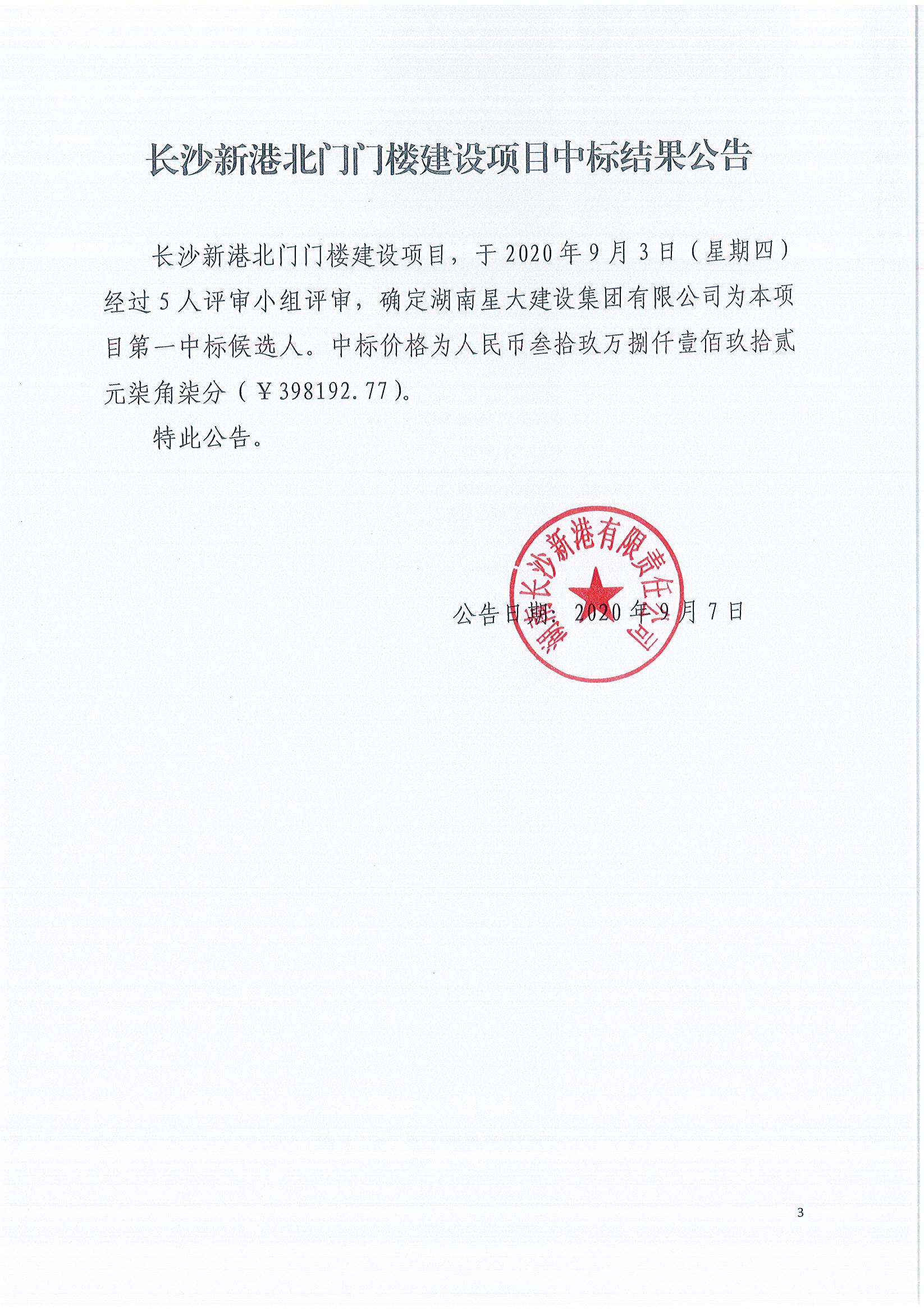 長沙新港北門門樓建設(shè)項(xiàng)目中標(biāo)結(jié)果公告