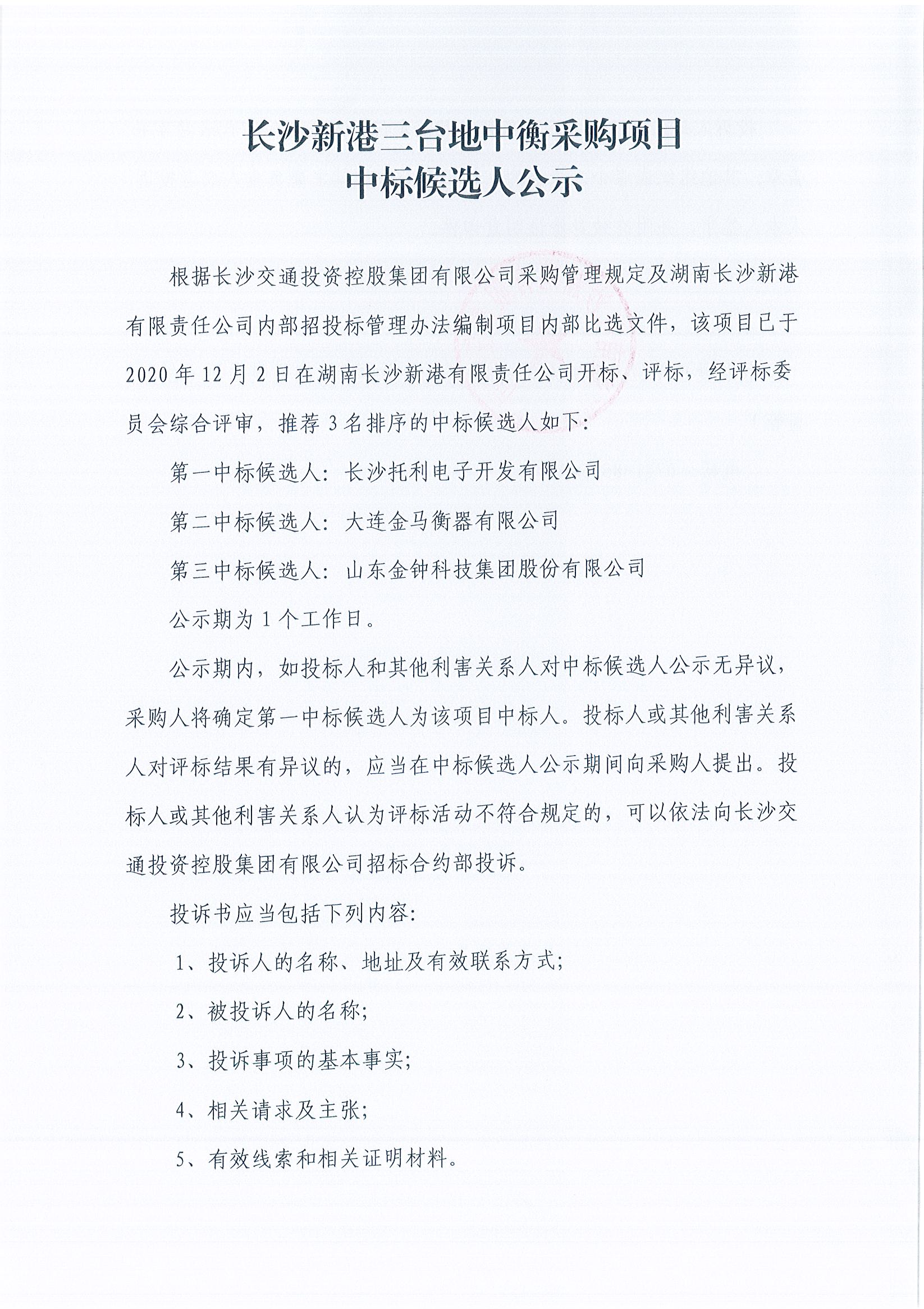 長沙新港三臺地中衡采購項(xiàng)目中標(biāo)候選人公示