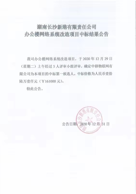 湖南長(zhǎng)沙新港有限責(zé)任公司辦公樓網(wǎng)絡(luò)系統(tǒng)改造項(xiàng)目中標(biāo)結(jié)果公告