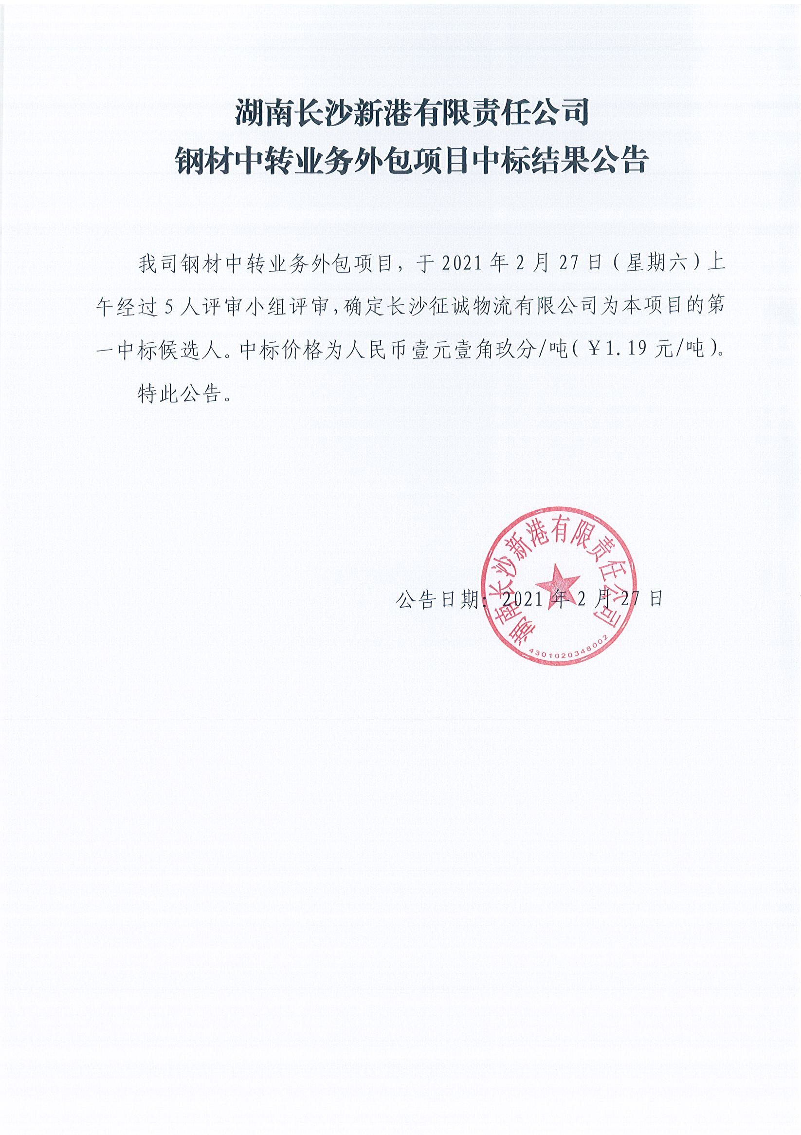 湖南長沙新港有限責任公司鋼材中轉業(yè)務外包項目中標結果公告