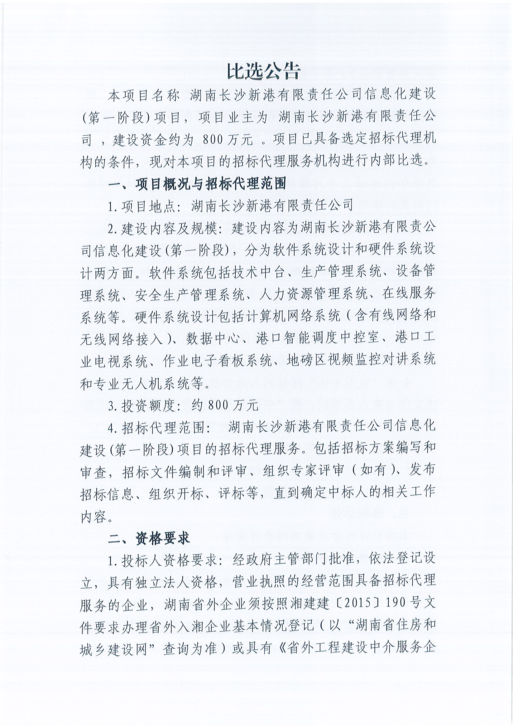 湖南長沙新港有限責(zé)任公司信息化建設(shè)(第一階段)招標代理服務(wù)機構(gòu)比選公告