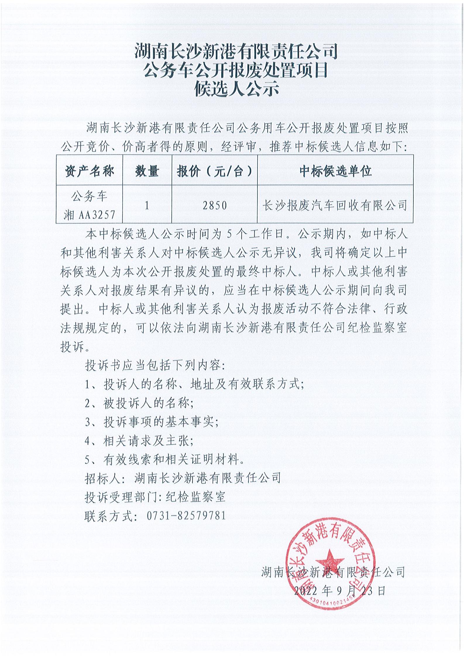 湖南長沙新港有限責任公司公務(wù)車公開報廢處置項目候選人公示