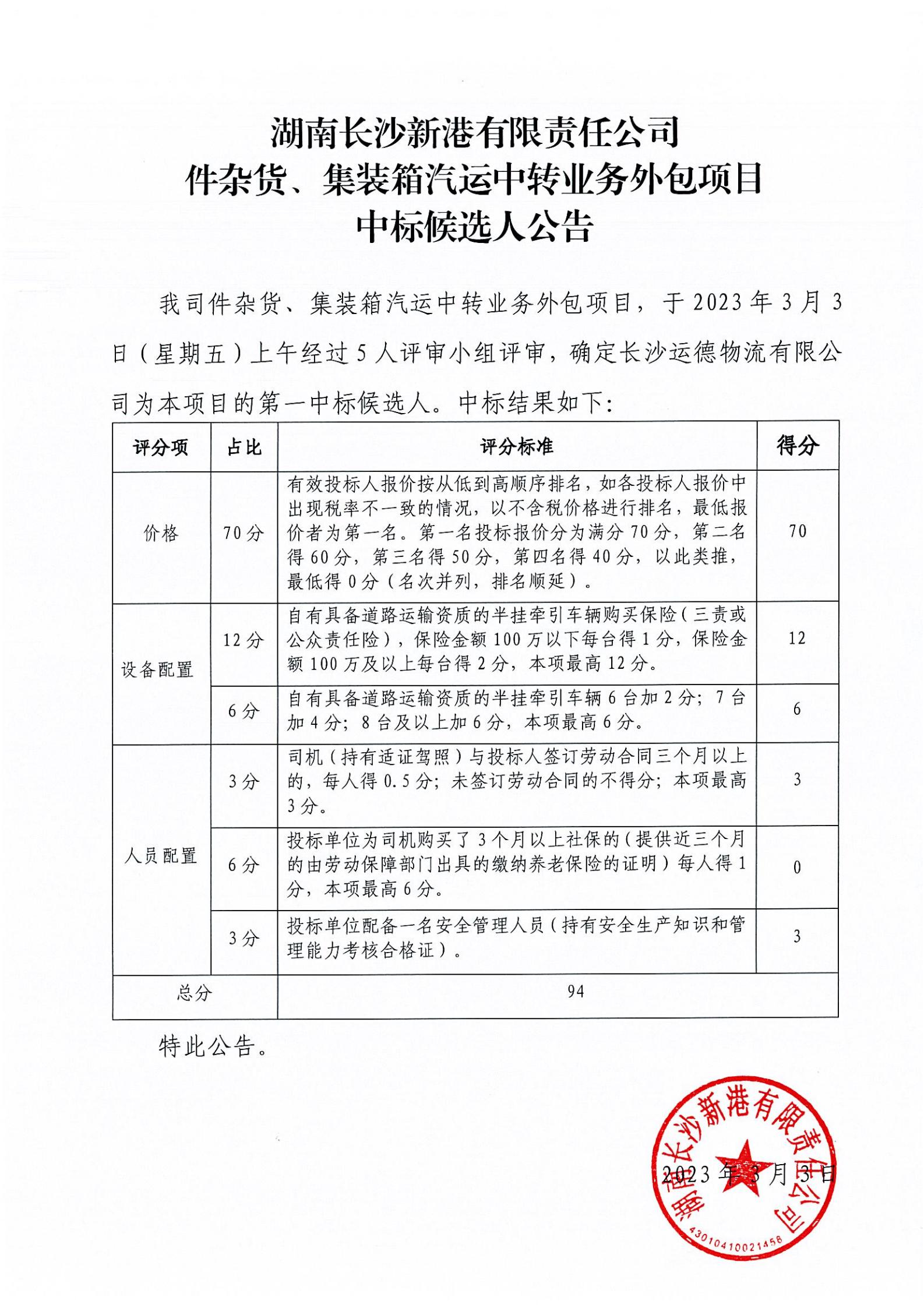 湖南長沙新港有限責(zé)任公司件雜貨、集裝箱汽運中轉(zhuǎn)業(yè)務(wù)外包項目中標候選人公告