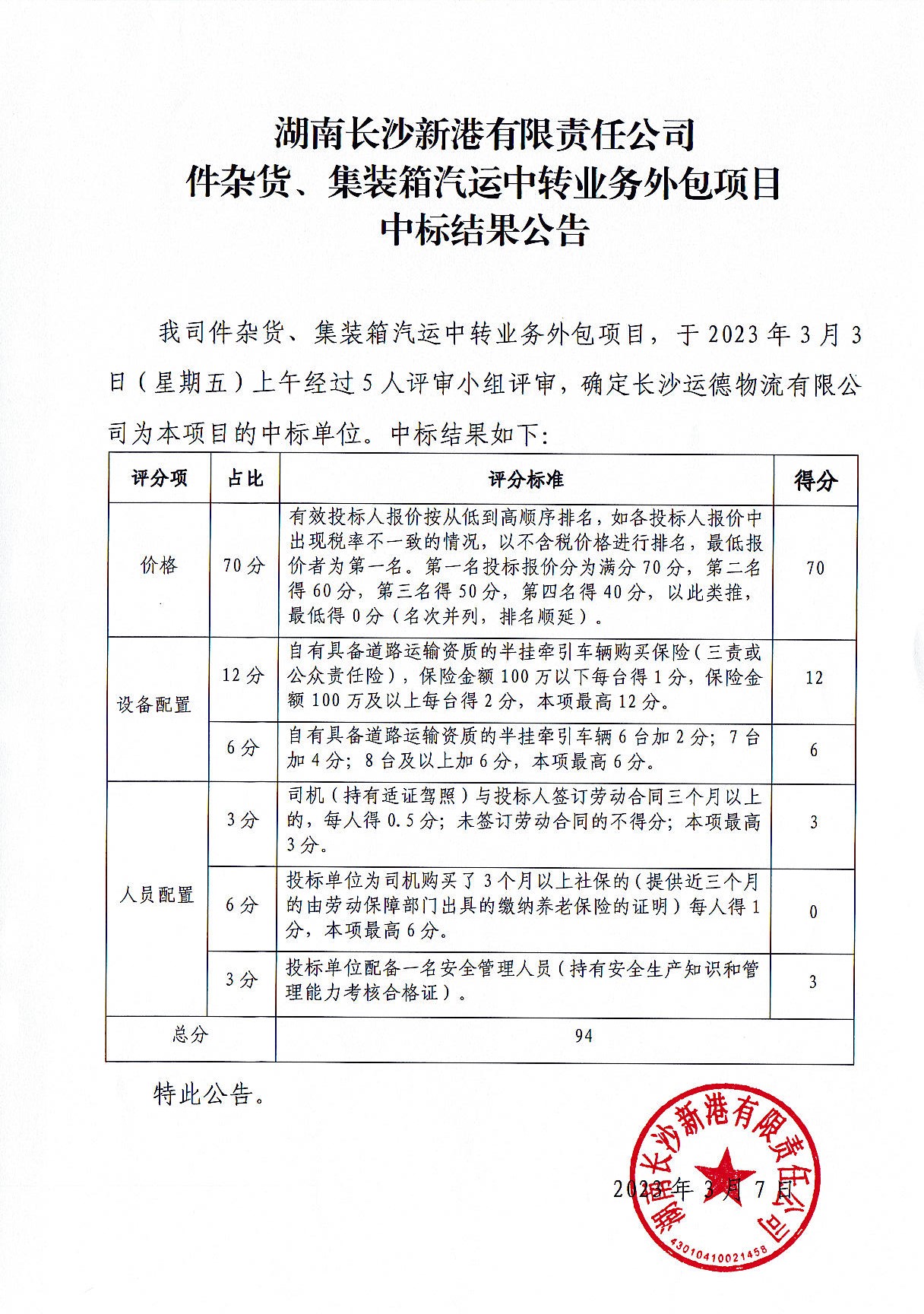 湖南長沙新港有限責任公司件雜貨、集裝箱汽運中轉(zhuǎn)業(yè)務(wù)外包項目中標結(jié)果公告