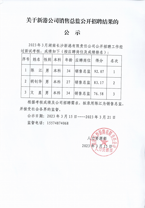 新港公司銷售總監(jiān)公開招聘結(jié)果的公示