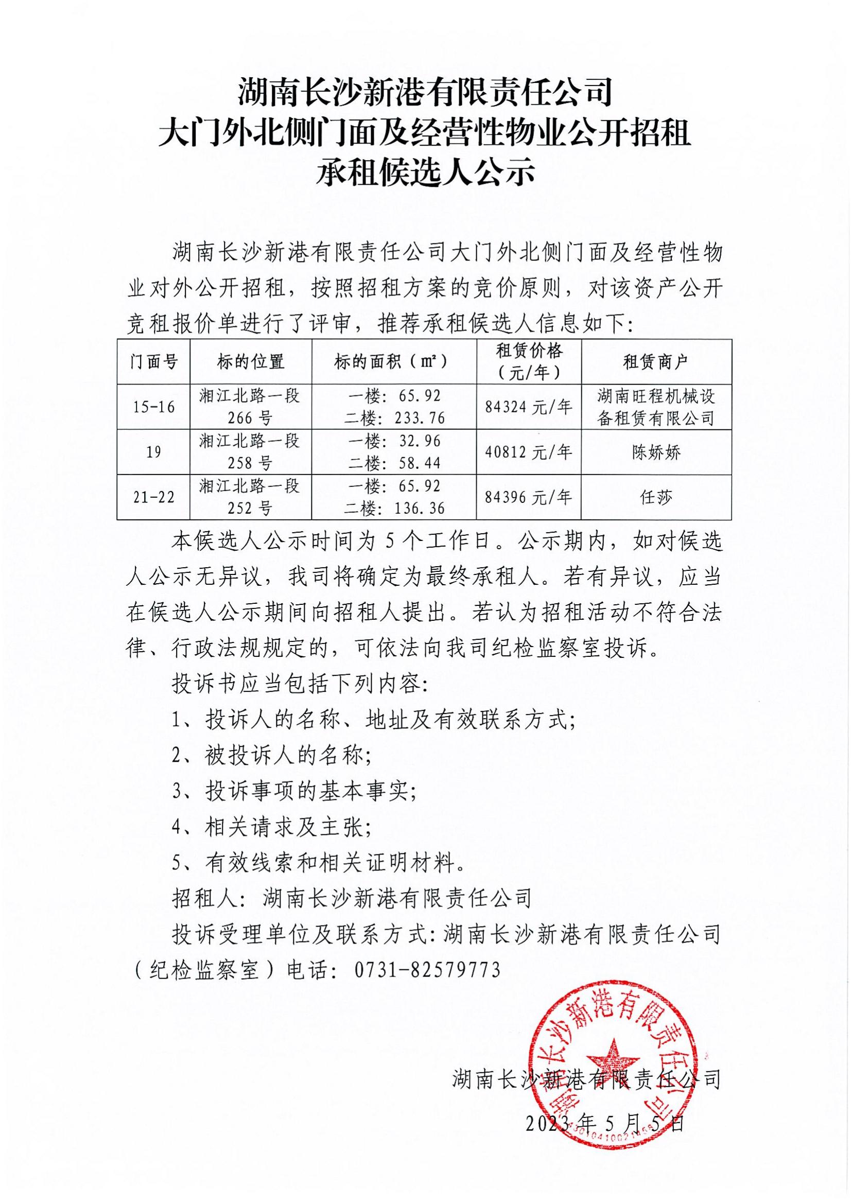 新港公司大門外北側(cè)門面及經(jīng)營性物業(yè)公開招租承租候選人公示