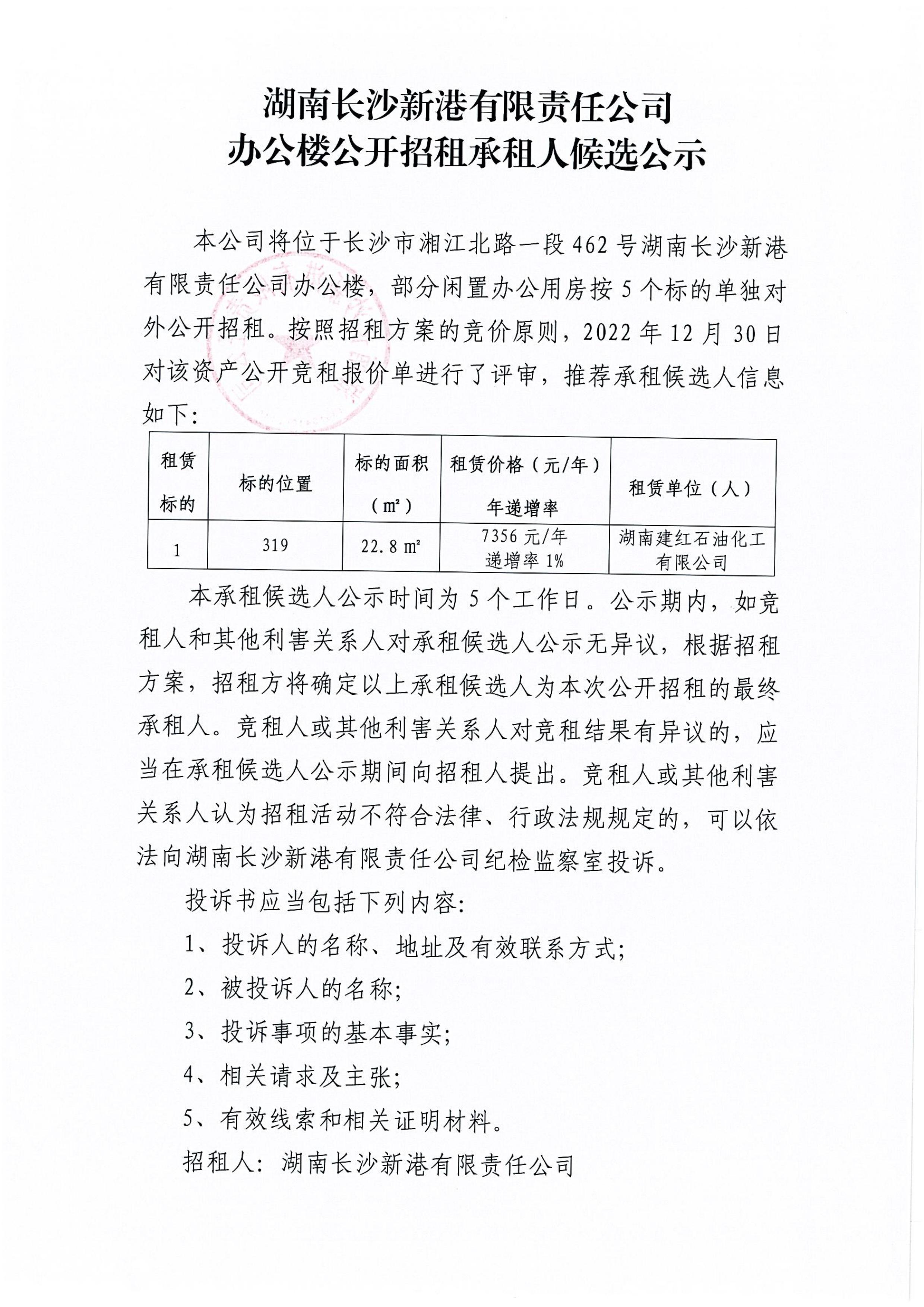 湖南長沙新港有限責任公司辦公樓公開招租承租人候選公示